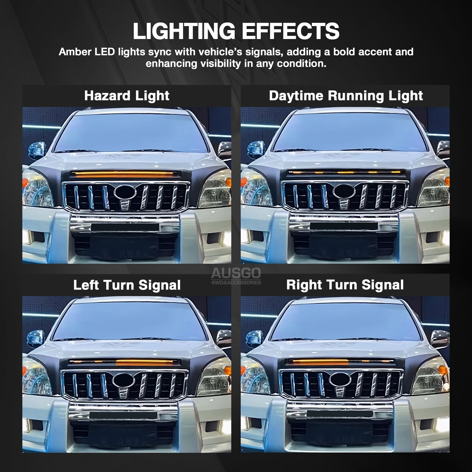 Enhance the look and protection of your Landcruiser Prado 120 with this LED light bonnet protector guard. Designed to integrate with your vehicle’s steering lights, it provides an upgraded appearance while offering durable protection against debris, rocks, and scratches.