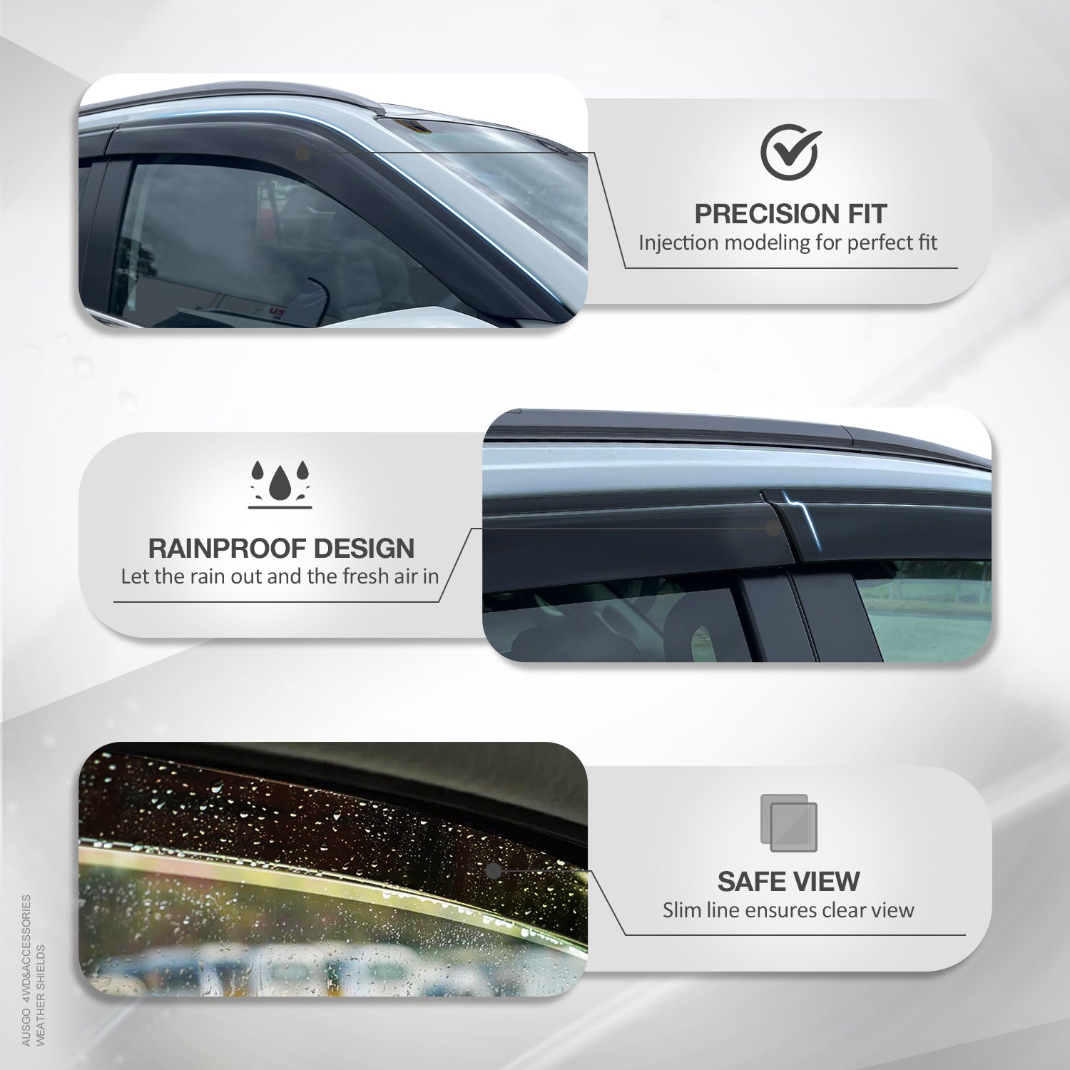 - Maximizes fresh air enjoyment. Keeps side windows dry in the rain.